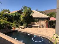 An entertainer’s dream, this property boasts a stunning entertainment area featuring a stylish wooden bar, built-in braai, ample built-in cupboards, a wash basin and a guest toilet. Enjoy a refreshing swim in the pool or host gatherings on the open deck with a second built-in braai and breathtaking views. A serene koi pond adds to the charm of this well-maintained home.