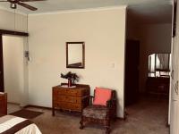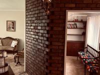 The residence welcomes you with a classic brick exterior and a red tiled roof, set amidst an expansive, neatly manicured lawn and lush, diverse garden landscaping featuring mature trees. Inside, the home boasts two spacious lounges, a dedicated dining room, and a family TV room, providing ample space for relaxation and entertainment. Architectural character is evident through distinctive brick archways and an accent wall in the living area. The modern kitchen is a highlight, equipped with light wood-grain cabinetry, dark countertops, integrated oven and microwave, a separate scullery, and a pantry, ensuring both style and functionality. A dedicated laundry room adds to the home's practicality.