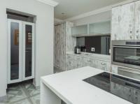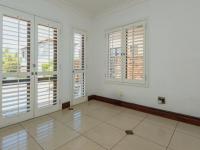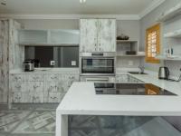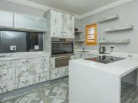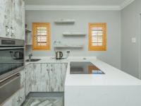 The bright living area features large windows with built in shutters, while the modern kitchen boasts high end appliances.