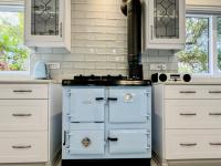 Gourmet kitchen featuring granite countertops, a breakfast bar, sleek cabinetry, a traditional AGA cooker, and a Smeg oven.