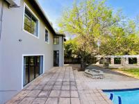 The exterior is an entertainer's dream, featuring a large, private swimming pool set amidst an expansive, meticulously maintained garden. Mature trees provide natural shade and enhance the lush, serene ambiance. A substantial paved patio, complete with a built-in braai and a stylish pergola with stone pillars, offers an ideal setting for al fresco dining and social gatherings. The property further boasts a spacious driveway and a balcony, complementing the modern house exterior with its elegant stone cladding.