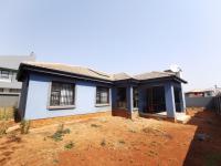 This contemporary single-story home in Hesteapark, Akasia, presents a striking first impression with its modern blue and grey exterior and durable tiled roof. A paved pathway and driveway lead to the property, offering convenient access and ample parking. The design reflects a fresh aesthetic, setting the tone for the stylish interiors within this secure estate.
