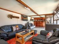 Spanning an impressive 420 square metres, the interior is designed for spacious living. The open-plan layout seamlessly connects the dining area with two distinct lounges, one serving as a dedicated family TV room. These communal spaces feature practical tiled flooring, decorative ceilings with recessed lighting, and a unique white brick-look accent wall. Large windows invite natural light, and air conditioning ensures year-round comfort. Sliding doors facilitate an effortless indoor-outdoor flow.