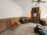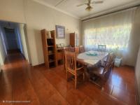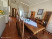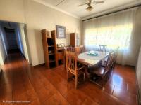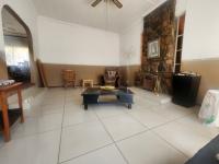 Enter through a fully tiled entrance passage secured with a safety gate. The lounge is warm and inviting, featuring tiled floors and a built-in fireplace—ideal for relaxing evenings or entertaining guests. A large dining area comfortably seats 8 to 12 people, making it perfect for family meals and gatherings.