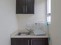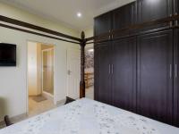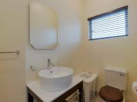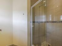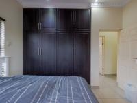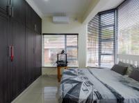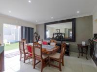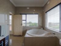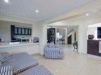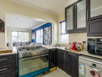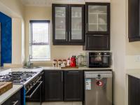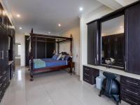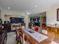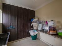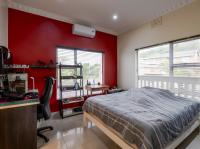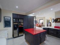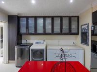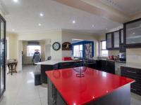 Step inside to an open-plan layout that seamlessly connects the living spaces. The lounge and dining room flow effortlessly, creating an ideal environment for both relaxation and entertaining. The heart of the home is a spacious, well-equipped kitchen featuring dark wood-style cabinetry, light quartz-like countertops, and a striking red-topped island. Modern appliances, including a gas hob and built-in oven, are integrated, alongside a convenient pantry and a dedicated laundry area with a washing machine, dryer, and chest freezer. This home also boasts a built-in bar and a braai room, perfect for social gatherings.