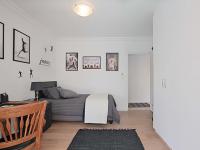 The contemporary kitchen is a highlight, equipped with sleek white cabinetry, stainless steel appliances, and a functional island with a stone countertop, ideal for casual dining or meal preparation. This central hub effortlessly connects to the dining area, fostering a social [hidden];