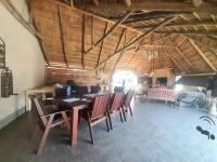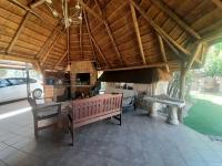 The main residence boasts a beautifully appointed antique-style kitchen, complete with a gas stove, and flows seamlessly into the open-plan dining area and lounge, where a cozy fireplace awaits chilly evenings. Laminated flooring throughout the living areas adds a touch of sophistication, while spacious passages lead to 3 spacious bedrooms with built-in cupboards. 2 modern bathrooms 1 being an en-suite.