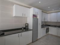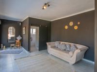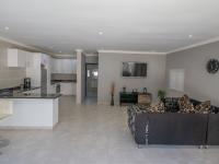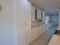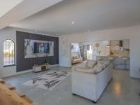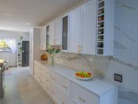 The kitchen features a centre island, breakfast bar, gas stove, and separate scullery, opening to a light-filled lounge and dining area. Parking is easy with three garages plus space for four additional vehicles. Extras include staff accommodation, storeroom, fibre, secure burglar guards, and a sparkling pool.