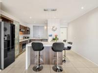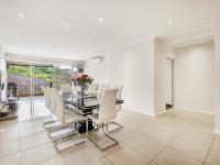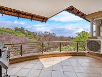 The open-plan kitchen is fitted with Caesarstone countertops, an electric stove and oven, a double sink, and space for three appliances plus a single-door fridge. It flows seamlessly into the air-conditioned lounge and dining area, where sliding doors open onto a generous covered balcony, perfect for hosting a braai with friends while enjoying the view over the jacaranda trees.