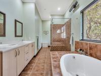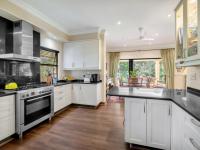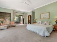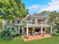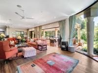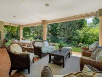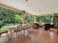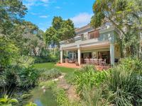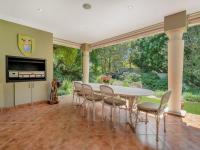 The covered patio is designed for year-round enjoyment with a Jetmaster gas braai and roll-down awnings. It overlooks the beautifully landscaped wraparound garden, where a pond feeds into a stream, creating a soothing natural backdrop.
