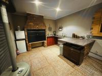 The kitchen is well-appointed with light wood cabinetry, granite-look countertops, a built-in oven, hob, and an extractor fan, complemented by a convenient pantry. Practical amenities include a laundry room, staff quarters, domestic rooms, outside toilets, and additional storage.