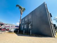 The exterior presents a modern architectural style with dark grey/blue buildings, complemented by extensive shaded parking under multiple carports over a paved lot. The property ensures convenience with two dedicated parking spaces, protecting vehicles from the elements. A security gate at the entrance enhances peace of mind, contributing to the kerb appeal and overall functionality.