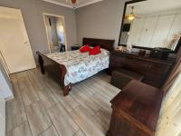 Accommodation includes three generously sized tiled bedrooms with plenty built-in cupboards for a organized environment creating a peaceful and relaxed sanctuary. The main bedroom features an en-suite bathroom with bath, basin and toilet, while the second bathroom offers a shower, basin and toilet. One of the bedrooms enjoys its own entrance and access to a front garden space – ideal for extended family, guests or a home office.