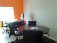 The interior is thoughtfully configured with multiple office and reception areas, each benefiting from natural light through large windows. Spaces feature diverse aesthetics, including vibrant orange accent walls and two-tone paint schemes, alongside durable wooden and hardwood flooring. Functional workspaces are equipped with desks and seating, while dedicated reception zones offer welcoming environments, some even featuring security monitor setups for enhanced oversight.