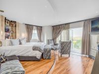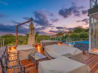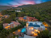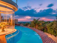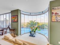 The entertainment wing includes a stylish bar area and dining space, all seamlessly connected through stacking doors to an expansive decked patio with built-in braai and sparkling pool — perfectly positioned to capture breathtaking views over Featherbrooke Estate.