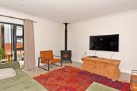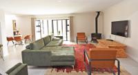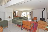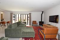 Downstairs - Massive open plan lounge, kitchen and scullery. Kitchen has a gas stove with an electric oven, space for a double door fridge. Lounge opens up to a big covered patio. Fire-place in the lounge. Guest toilet.