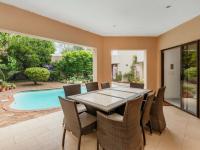 The living areas are exceptional — two large lounges open seamlessly to the dining area, which features sliding doors leading to the sparkling pool. The modern open-plan kitchen is equipped with granite countertops, ample built-in cupboards, a pantry, a scullery, and a dishwasher connection. A side door from the kitchen provides easy access to the pool and entertainment area.
