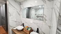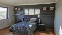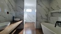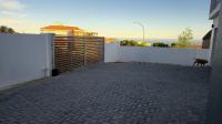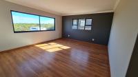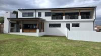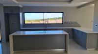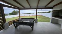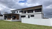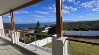 Downstairs, you are welcomed by a vast, light-filled open-plan living area featuring a modern kitchen with a separate scullery and pantry, flowing effortlessly into the dining room and lounge/TV area. The built-in braai/fireplace creates a warm, inviting atmosphere — perfect for entertaining all year round. Large stackable doors open to the outdoor patio, which also includes a built-in braai, allowing you to take in spectacular ocean views even from the ground floor.
