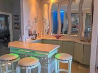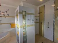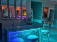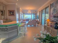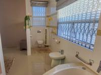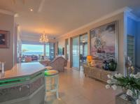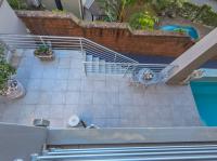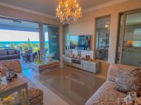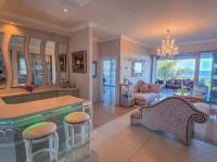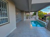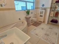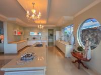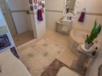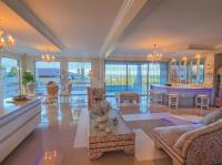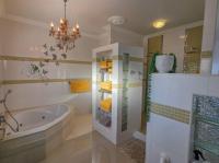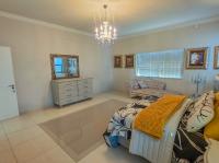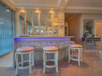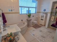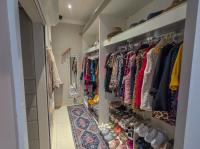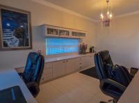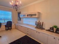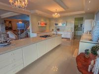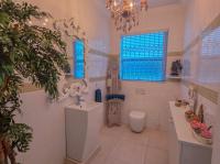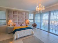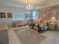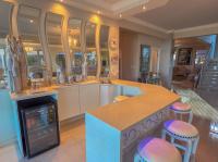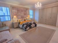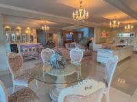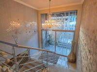 Inside, the open-plan layout flows effortlessly across three lounges and a formal dining area. Polished tiles, crystal chandeliers, and designer lighting create a sophisticated atmosphere. A feature staircase with sleek railings connects the levels, while a modern bar area adds a touch of style for relaxed entertaining. Every detail, from the air conditioning to the tasteful finishes, reflects careful attention to comfort and quality. The residence includes four spacious bedrooms (one of which is currently used as a study) and three beautifully appointed bathrooms. Each room offers privacy and luxury, ideal for family living or hosting guests.