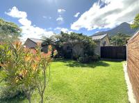 Outdoors, a sparkling pool and covered braai area create the ideal setting for relaxed weekends or summer gatherings. The lush garden is framed by mature trees and mountain views, adding a sense of serenity to every corner of the property.