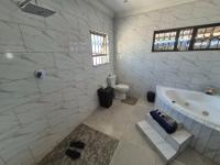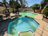 Step outside to a private garden oasis, complete with a sparkling swimming pool and a built-in braai, ideal for outdoor entertaining and enjoying the South African climate. The property also benefits from extensive paving, three garages, and eight additional parking spaces, catering to multiple vehicles and guests. An outside toilet adds to the convenience for outdoor activities.