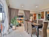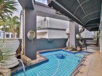 Step outside through sliding doors to a private garden oasis, perfect for outdoor enjoyment. The property features a refreshing swimming pool and a built-in braai, ideal for hosting gatherings. Practical elements include two garages and three additional parking spaces, all set on a manageable 250 sqm erf with attractive paving.