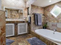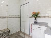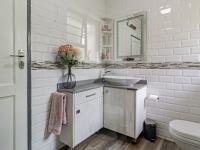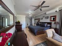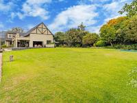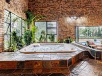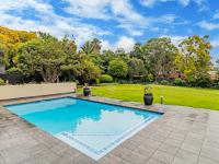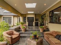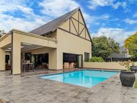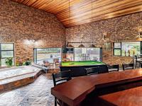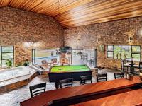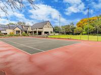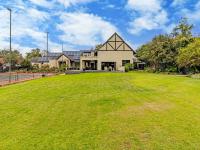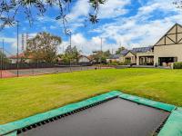 Step outside to a tiled patio with a built-in braai, overlooking the sparkling blue fiberglass swimming pool, manicured garden, and a tennis court with floodlights – perfect for active family fun or entertaining guests.