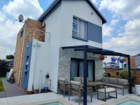 Discover modern living in this stylish 220 sqm home ideally situated within a secure estate of Bella Rosa in the suburban heart of Roseacre, Johannesburg. The property immediately impresses with its contemporary architectural design featuring a striking white and dark grey exterior complemented by elegant stacked stone accents and an inviting upper level balcony.