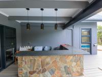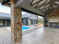 Outdoor living is paramount here, with an expansive wooden deck featuring an integrated plunge pool, perfect for cooling off. The covered patio hosts a built-in bar, a built-in braai, and a fire pit, creating an ultimate entertainment zone. A traditional lapa further enhances the outdoor experience. Practical amenities include a double garage, additional parking, and a natural garden that blends seamlessly with the surrounding wildlife estate.