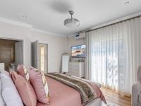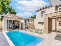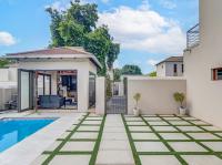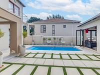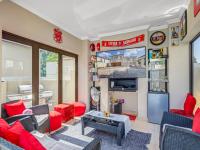 The outdoor space is beautifully finished with sleek concrete slabs and manicured AstroTurf, framing a sparkling, recently upgraded pool adorned with imported Italian tiles. Adjacent to this, the entertainment clubhouse/mancave features a built-in braai and stackable doors – creating a seamless indoor-outdoor flow for year-round gatherings.