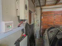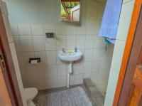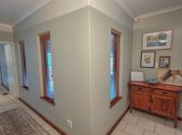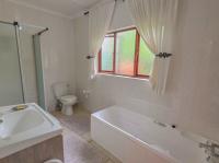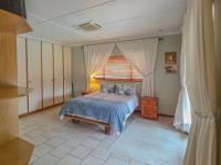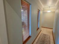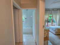 The kitchen forms the heart of the home, featuring granite countertops, a glass-fronted cupboard, and a built-in fridge space. A skylight adds soft natural light throughout the day, creating a pleasant and functional space. Down the passage are three bedrooms. The main bedroom opens to the pool area and offers ample cupboard space, along with an ensuite bathroom fitted with a bath, toilet, and basin. The two additional bedrooms are both well-sized and share a full bathroom with a bath, shower, basin, and toilet.