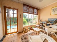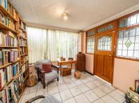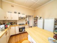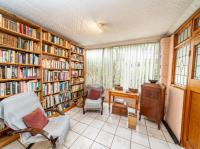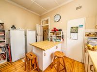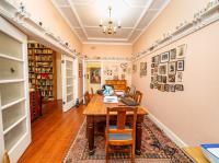 The well-designed kitchen is the heart of the home, fitted with a gas stove, breakfast nook, and walk-in pantry. There’s ample cupboard space, and the adjoining scullery includes a double sink, space for two appliances, and a second walk-in storage area. The kitchen connects seamlessly to a bright sunroom with west-facing windows that capture pleasant afternoon light, opening onto the back garden.