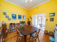 The home opens to a welcoming front entrance with large east-facing windows that fill the space with morning light. A spacious dining area comfortably accommodates an eight-seater table and flows naturally into the cozy lounge and TV room, complete with a wood-burning fireplace perfect for family gatherings or relaxed evenings.