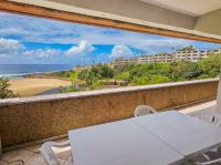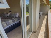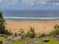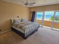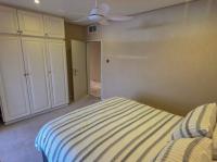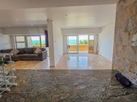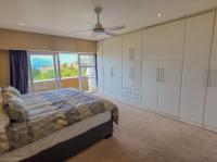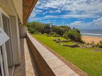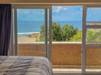 The ground-floor apartment itself is a showcase of coastal elegance. The open-plan kitchen, dining, and lounge areas flow together effortlessly, leading out through large glass doors to a spacious patio with spectacular views over Uvongo Beach. The main bedroom shares this view and opens directly onto the patio. It includes a full en suite bathroom with a bath, shower, double basin, and toilet.