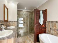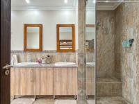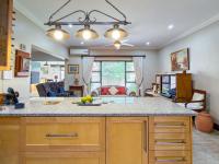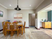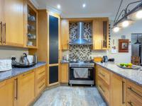 Step inside to an inviting open-plan layout, seamlessly connecting the lounge, dining area, braai room and kitchen. The spacious kitchen is a highlight, featuring ample light wood cabinetry, extensive granite countertops, and a mosaic tile backsplash. Equipped with a modern stainless steel oven, gas hob, extractor fan. Adjacent, a dedicated scullery/laundry room offers a double sink, appliance space, and convenient direct garden access. Tiled flooring flows throughout these living spaces, enhanced by natural light from large windows and sliding glass doors.