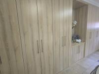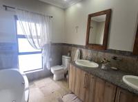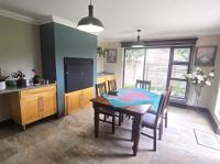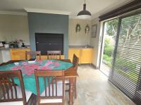 Step inside to an inviting open-plan layout, seamlessly connecting the lounge, dining area, braai room and kitchen. The spacious kitchen is a highlight, featuring ample light wood cabinetry, extensive granite countertops, and a mosaic tile backsplash. Equipped with a modern stainless steel oven, gas hob, extractor fan. Adjacent, a dedicated scullery/laundry room offers a double sink, appliance space, and convenient direct garden access. Tiled flooring flows throughout these living spaces, enhanced by natural light from large windows and sliding glass doors.