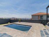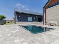 The outdoor area is a private oasis, complete with a heated swimming pool and an extensive paved patio. A dedicated covered entertaining space features a built-in braai, ideal for social gatherings. The home includes a family TV room, reception area, laundry, pantry, and ample storage.