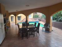 Outdoor living is a highlight centered around a large swimming pool and an extensive paved patio. A covered outdoor entertainment area characterized by its arched openings provides a shaded retreat perfect for relaxation or al fresco dining. The property further benefits from four garages and eight additional parking spaces accessible via a paved brick driveway ensuring ample secure parking for residents and guests. A security gate at the entrance enhances peace of mind.