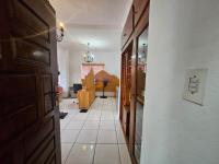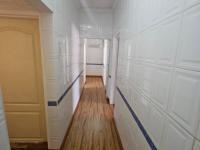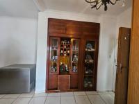This distinguished residence in Johannesburg's Winchester Hills presents a pristine white exterior complemented by a formal columned entrance. An extensive brick-paved driveway, featuring a practical green-striped awning, offers ample covered and open parking. The interior reveals an open-plan design, seamlessly connecting the dining and living areas, characterized by warm wooden flooring and a distinctive geometric wooden panelled ceiling in the lounge.