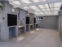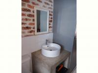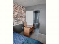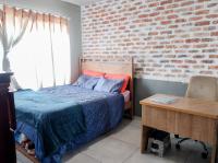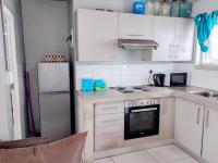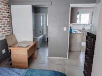 The modern kitchen offers concrete-style countertops that add a touch of industrial charm, along with ample cupboard space, a stove, under-counter oven, and room for a single-door fridge and one water appliance. It’s a well-designed space that blends functionality with a modern aesthetic. The kitchen flows seamlessly into the bright and spacious open-plan lounge, creating a warm and inviting atmosphere for everyday living.