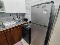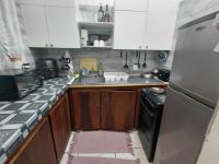 Open plan living area and kitchen fitted build in cupboards, and stove