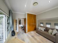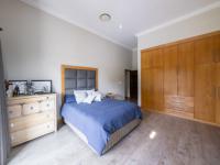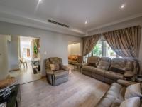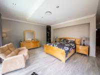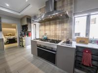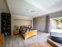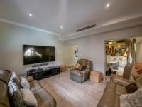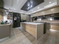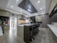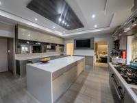 Step inside to a bright and spacious interior, characterized by an open-plan design, high ceilings, and abundant natural light filtering through large windows. The home features three distinct lounge areas and a dedicated dining room, providing versatile spaces for relaxation and entertaining. Modern recessed lighting, clean wood laminate and tiled flooring, and a contemporary staircase with sleek metal railings enhance the sophisticated ambiance. A notable highlight is the well-equipped home bar, perfect for social gatherings.