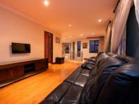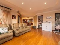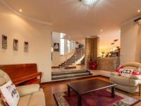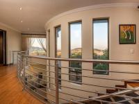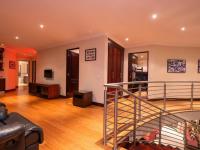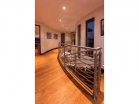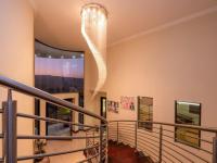The heart of the home is the gourmet kitchen, featuring rich dark wood cabinetry, a modern 4-plate electric glass hob paired with 2 gas burners, a spacious walk-in pantry, and a fully equipped scullery and laundry area. The open-plan layout flows effortlessly into the formal dining room and three elegant lounge spaces, complemented by large tiled and laminated flooring and an impressive curved staircase.