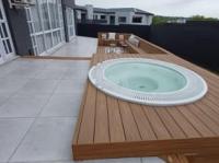 Beyond the interior the property extends its allure to an expansive 1562m2 erf creating a private outdoor sanctuary. A modern paved patio, complete with stylish built-in wooden seating frames an indulgent integrated jacuzzi – perfect for sophisticated entertaining or tranquil relaxation. A dedicated deck and lush garden further enhance the outdoor experience complemented by a scenic view that adds to the home's serene ambiance. Practical amenities include sta