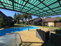 The expansive outdoor area is a true highlight, featuring a large, well-maintained swimming pool and lush, mature gardens, perfect for entertaining or unwinding. A built-in braai area promises delightful outdoor gatherings. The property also includes a rustic outbuilding, staff quarters, and a valuable flatlet, offering versatile accommodation options. With three garages and an access gate, convenience and secure parking are assured. Pets are welcome to enjoy the vast garden space.