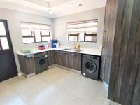 Inside, expansive open-plan living areas include two lounges and a dining room, all featuring durable tiled flooring and abundant natural light. The well-appointed kitchen boasts extensive light-wood cabinetry, an island with a sink, built-in double oven, microwave, and a gas hob, catering to all culinary needs. A dedicated laundry area and the second lounge or entertainment room featuring a large built-in jacuzzi complete the interior, offering a private oasis for relaxation.