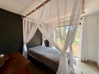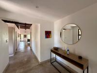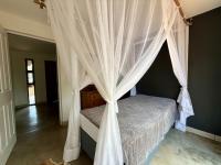 Discover an exceptional rental opportunity within the prestigious Raptors View Wildlife Estate in Hoedspruit. This fully furnished property offers four spacious bedrooms and two and a half bathrooms, including a convenient guest toilet and one en-suite. The interior boasts a contemporary open-plan design, seamlessly integrating the lounge, dining area, and a modern kitchen. Characterised by a striking vaulted thatched roof with exposed wooden beams and polished concrete floors, the home exudes a unique rustic-modern aesthetic. The kitchen is well-appointed with sleek cabinetry, a large island featuring an integrated sink, a gas hob, and a dedicated pantry.