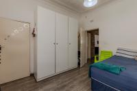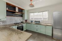 As you enter the yard, head up a few steps, and land on a tiled patio that catches proper morning sun. Inside, you’ve got a massive, bright lounge that flows into a dining space and kitchen. The kitchen has soft mint cabinetry with concrete countertops that add character and charm.