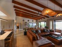 Outdoor living is paramount, with an expansive covered patio serving as the heart of entertainment. This area includes distinct lounge and dining zones, enhanced by a unique natural branch ceiling and ceiling fans. Step out to the private infinity-edge swimming pool, surrounded by a spacious wooden deck perfect for sun lounging. A built-in braai, lapa, and a dedicated fire pit area provide ample opportunities for social gatherings, while a luxury outdoor bathtub offers a unique relaxation experience amidst scenic bushland views. The property also includes two parking spaces and a driveway.