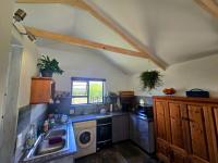 A warm and inviting open-plan living area with vaulted ceilings and wood-look tiled flooring, an open-plan kitchen, one bedroom and a bathroom with shower, toilet and basin.
